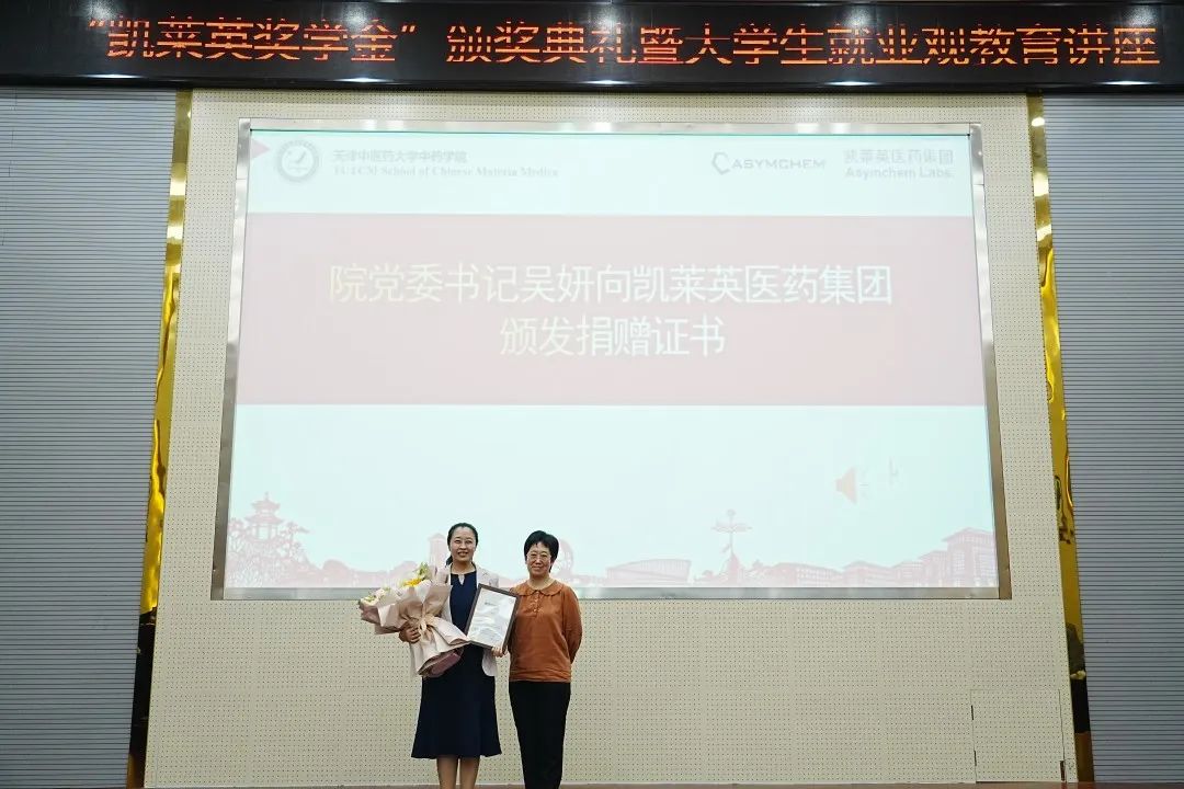 中药学院党委书记吴妍为凯莱英医药集团人力资源部执行总监李翠莲女士颁发《奖学金捐赠证书》。