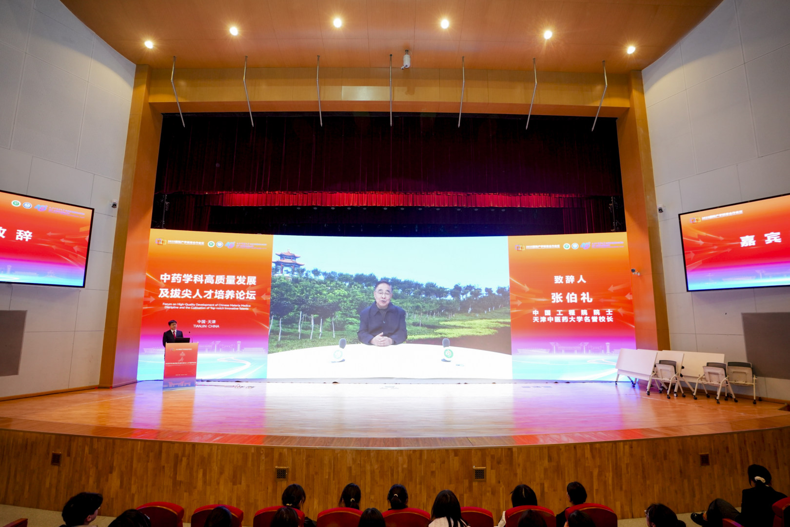 中国工程院院士、天津中医药大学名誉校长张伯礼以视频形式向大会致辞,他对中药学院四十年来的发展成就表示祝贺。他指出,中药学院从建院之初单一专业起步,到形成覆盖中药学、药学、临床药学、中药资源与开发、药物制剂等多专业协同发展的布局,中药学院始终与学校同呼吸、共命运,一步一个脚印,走出了一条特色鲜明,内涵丰富的高质量发展之路。作为学校历史最悠久,底蕴最深厚的学院之一,中药学院不仅是学校发展的亲历者、建设者,更是中医药传承创新发展推动者,所有成就的取得离不开一代代中药人潜心治学、甘于奉献的坚守和奋斗,也离不开广大校友情系母校的深情。他希望中药学院以建院40周年为起点,继续坚持“传承精华、守正创新”,在学科建设、人才引育、科研平台、国际交流等方面持续发力,争创更大成果。他对中药学院的发展提出三点建议,一是要强化使命引领,牢牢把握立德树人根本任务,培养更多堪当民族复兴大任的中医药高素质人才;二要勇攀科技高峰,聚焦中药现代化、产业化的关键核心技术,力争取得更多的突破性成果;三要加强开放融合,加强校内与校外、国内与国外等顶尖机构的合作,推动中医药更好走向世界;四要涵养学院文化、传承优良传统、弘扬科学家精神,营造潜心治学、追求卓越的良好生态。同时,他向学院送出祝愿,愿学院上下始终坚守初心,让中医药文化的千年智慧在新时代焕发新的生机;愿学院上下始终勇立时代潮头,做科技创新的先行者,为中药现代化注入强劲动能;愿学院上下始终胸怀“国之大者”,做服务人民健康的践行者,把中药福祉带给广大百姓;愿学院上下始终团结奋进、继往开来,在建设世界一流中医药大学的征程中再创辉煌、谱写新篇章。