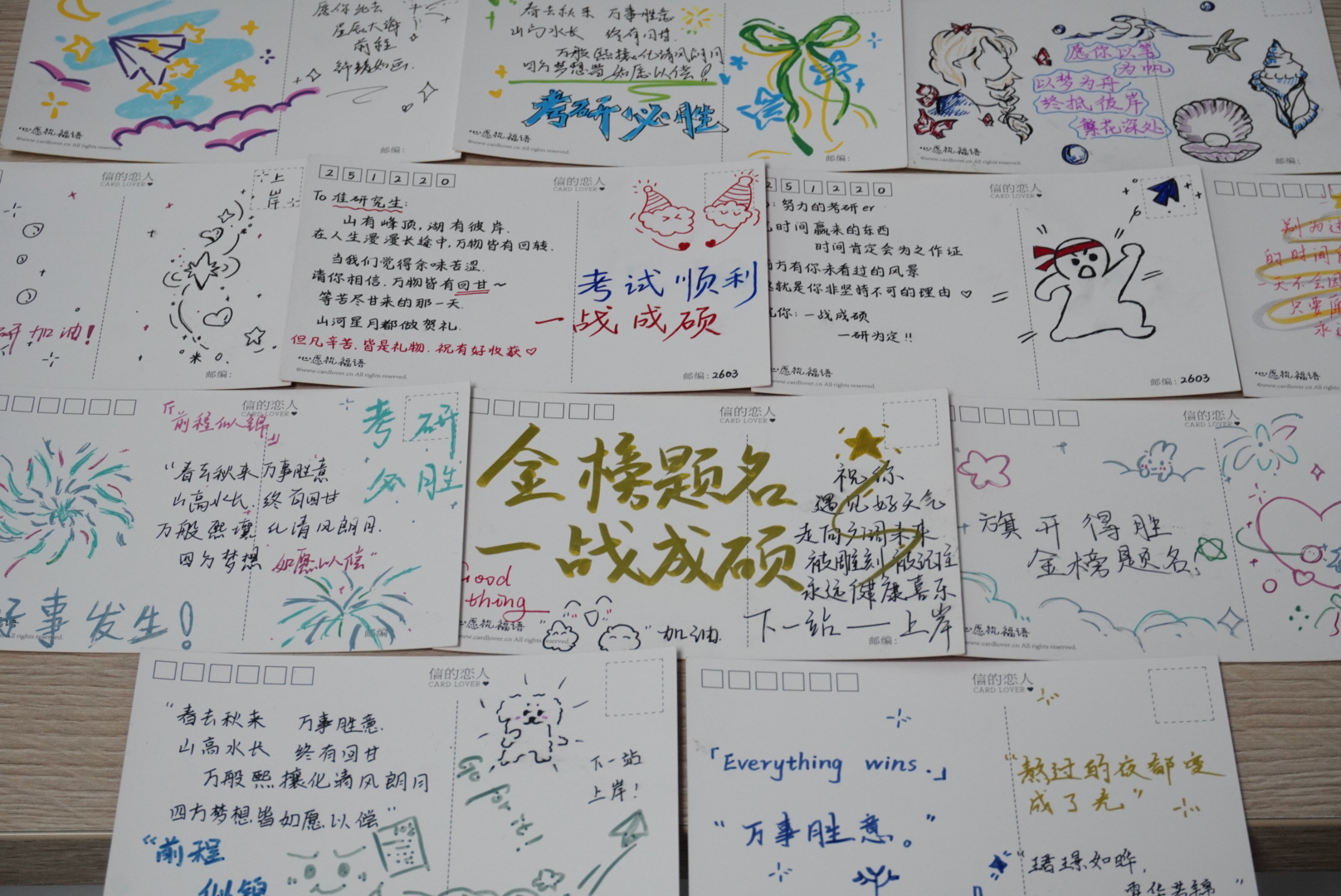 学弟学妹亲手书写绘制的明信片,字迹工整,图画真挚,承载着最纯粹的鼓励与守望。方寸之间,是中药学院大家庭薪火相传的温情,是后来者对学长学姐最坚定的支持。