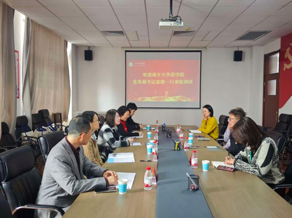 3月25日,南开大学药学院党委副书记袁婧一行到访我院,围绕党的建设、专业建设、人才培养及学生工作等方面开展调研交流。中药学院党书记任晓亮、副书记王琦、纪委书记姚远、党政综合办公室副主任周建成、学办负责人赵小双出席调研活动。