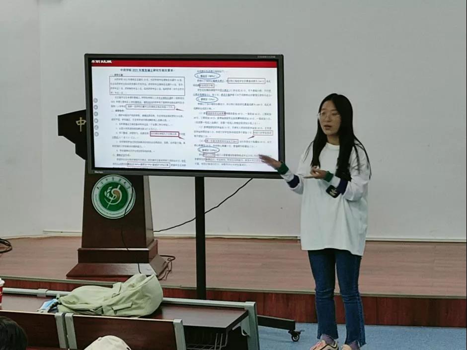 袁也学姐向大家具体地介绍了政治、英语、专业课的备考经验,也结合自身实际情况向同学们推荐了一些合适的学习资料。强调学习要注重合理分配时间、劳逸结合、提高效率;切勿焦虑,良好的心态才是制胜法宝。