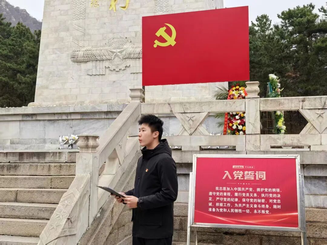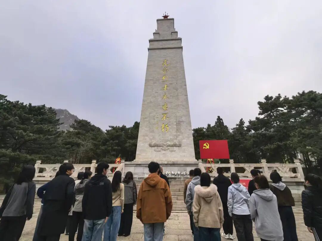 当日上午,师生党员抵达盘山烈士陵园后,在烈士纪念碑前举行庄重的祭扫仪式。全体人员列队肃立,脱帽默哀,表达对革命先烈的深切缅怀与崇高敬意。随后,学生中资党支部书记张顶领誓,全体党员面向党旗重温入党誓词,坚定初心使命。学生党员陈思汛以“传承英烈精神,践行使命担当”为题开展主题微党课,结合盘山地区革命先烈事迹,激励广大师生党员传承英烈精神。最后,全体人员有序绕纪念碑一周,瞻仰烈士纪念设施,缅怀先烈功绩。